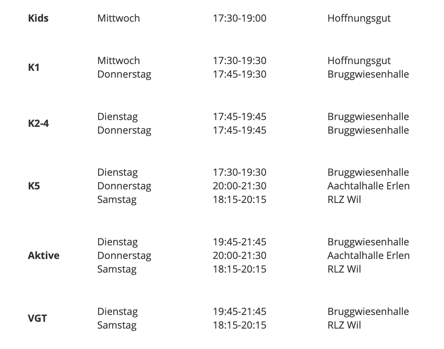 Die Trainings finden wöchentlich zu den oben genannten Zeiten statt. In den Schulferien sowie an Feiertagen findet das Geräteturnen nicht statt. Trainingsausfälle werden via Infomail oder in den Gruppenchats kommuniziert. Wir erwarten, dass die Kinder die Trainings regelmässig besuchen. Falls dies einmal nicht möglich ist, bitten wir die Eltern oder die Turnerinnen selbst, sich frühzeitig bei den Leiter:innen abzumelden (WhatsApp, SMS).